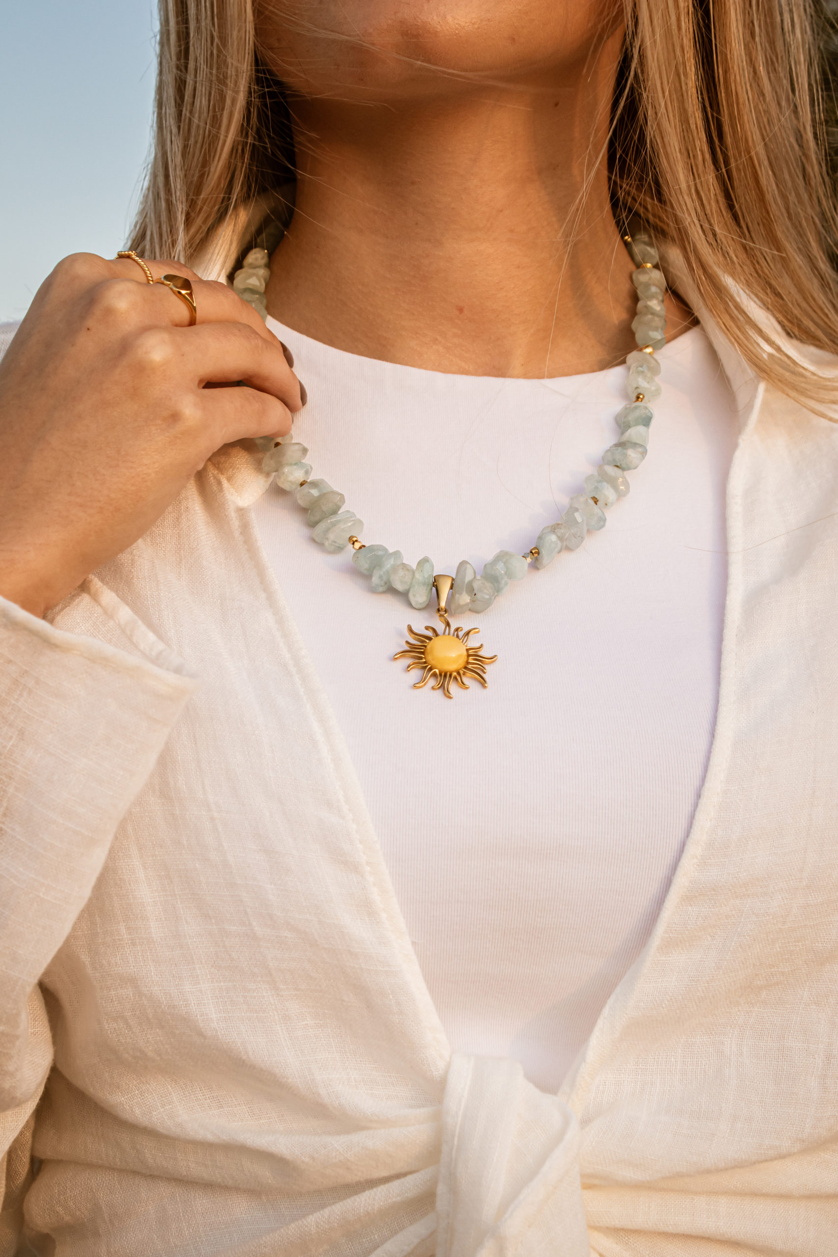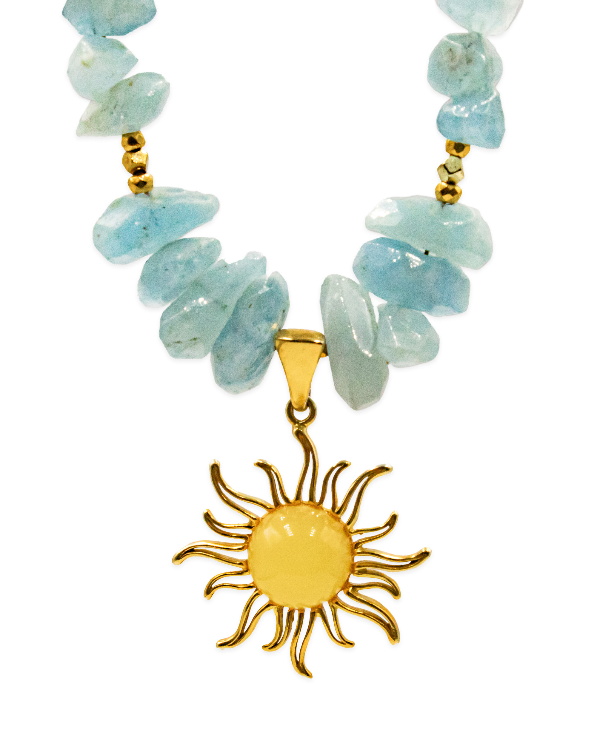 Necklace with aquamarine, milky amber and gold-plated elements.