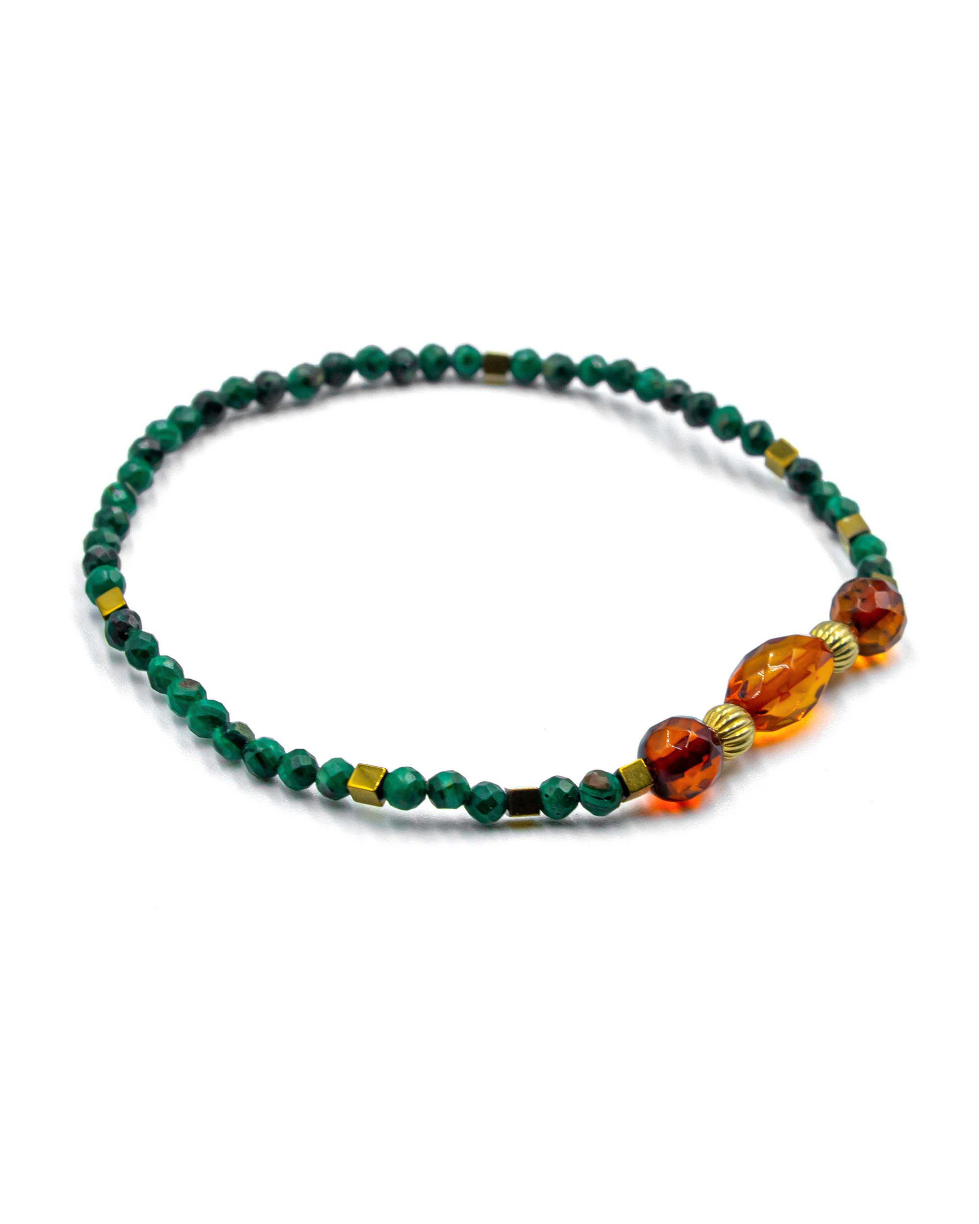 Elastic bracelet with malachite stone, gold-plated silver and a facet, cognac amber.