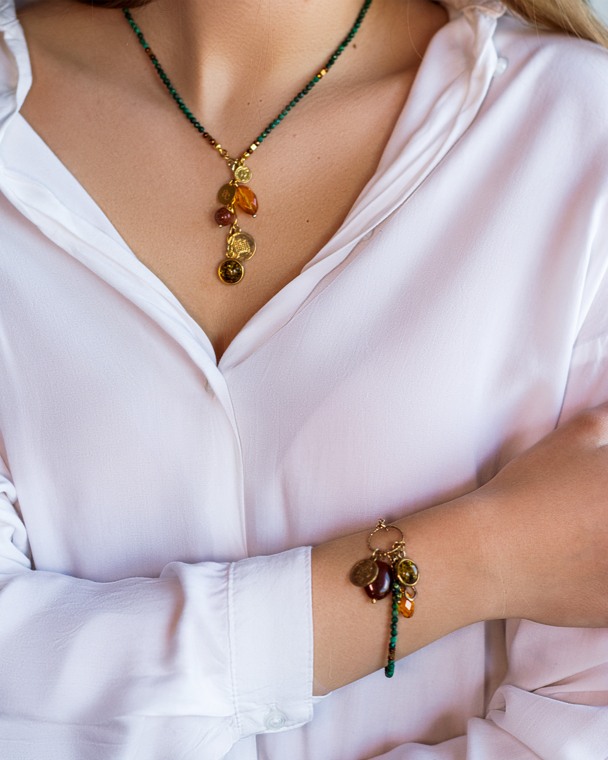 Necklace with malachite, golden and brown hematite, gold-plated silver and decorative elements.