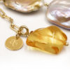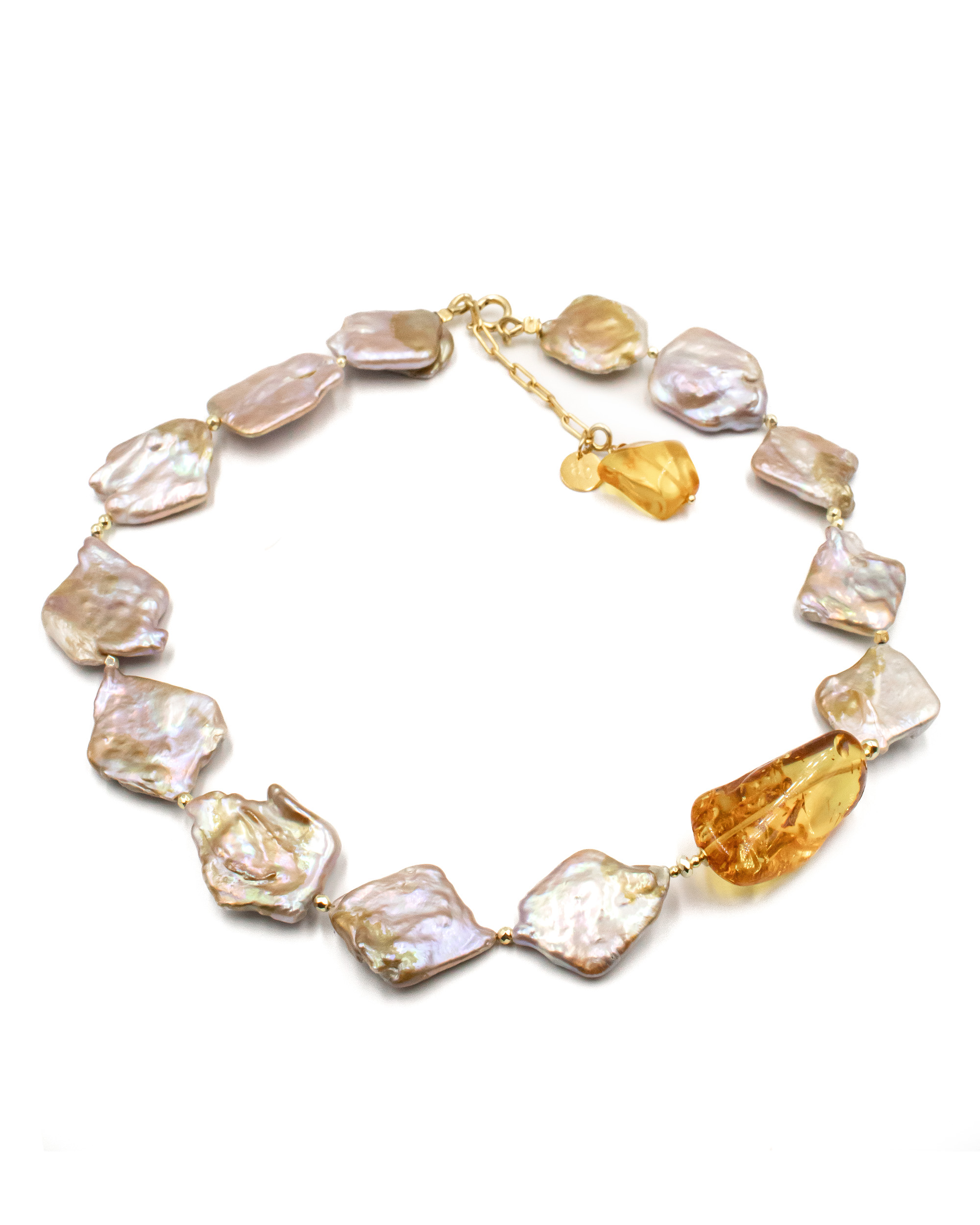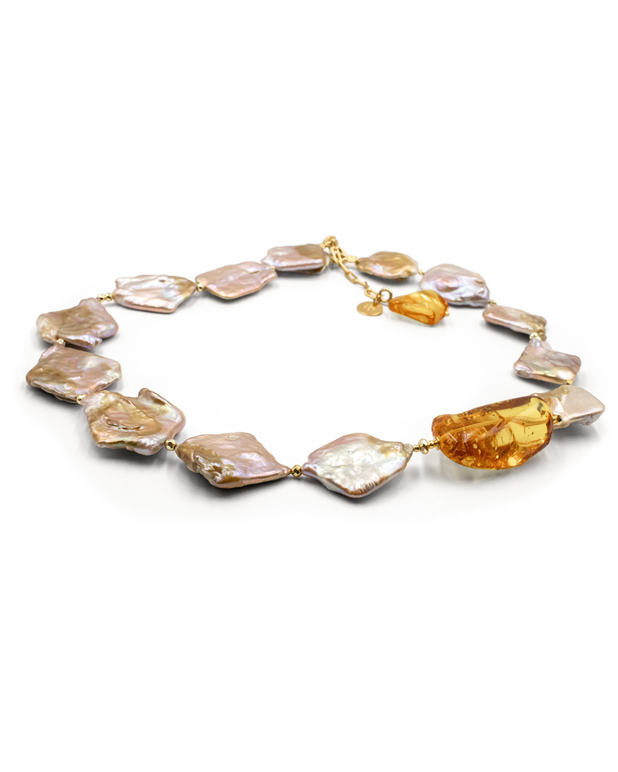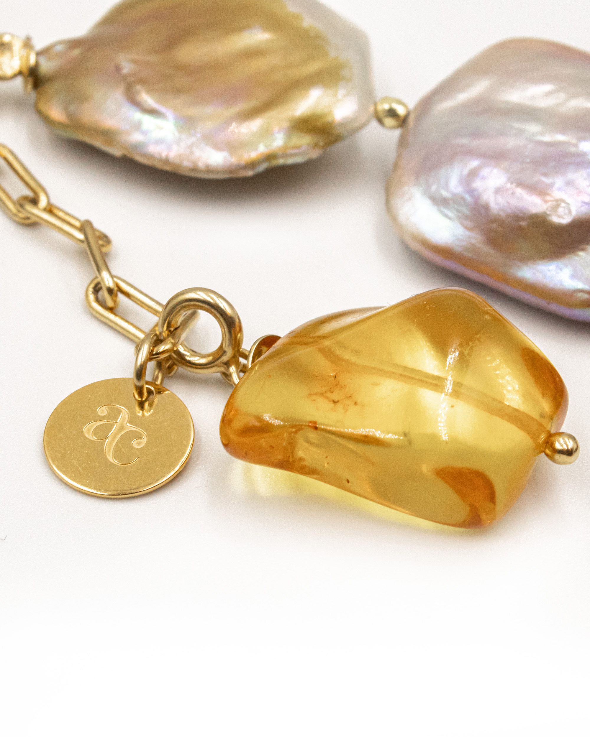 Necklace with baroque pearls, cognac amber and a gold-plated elements.