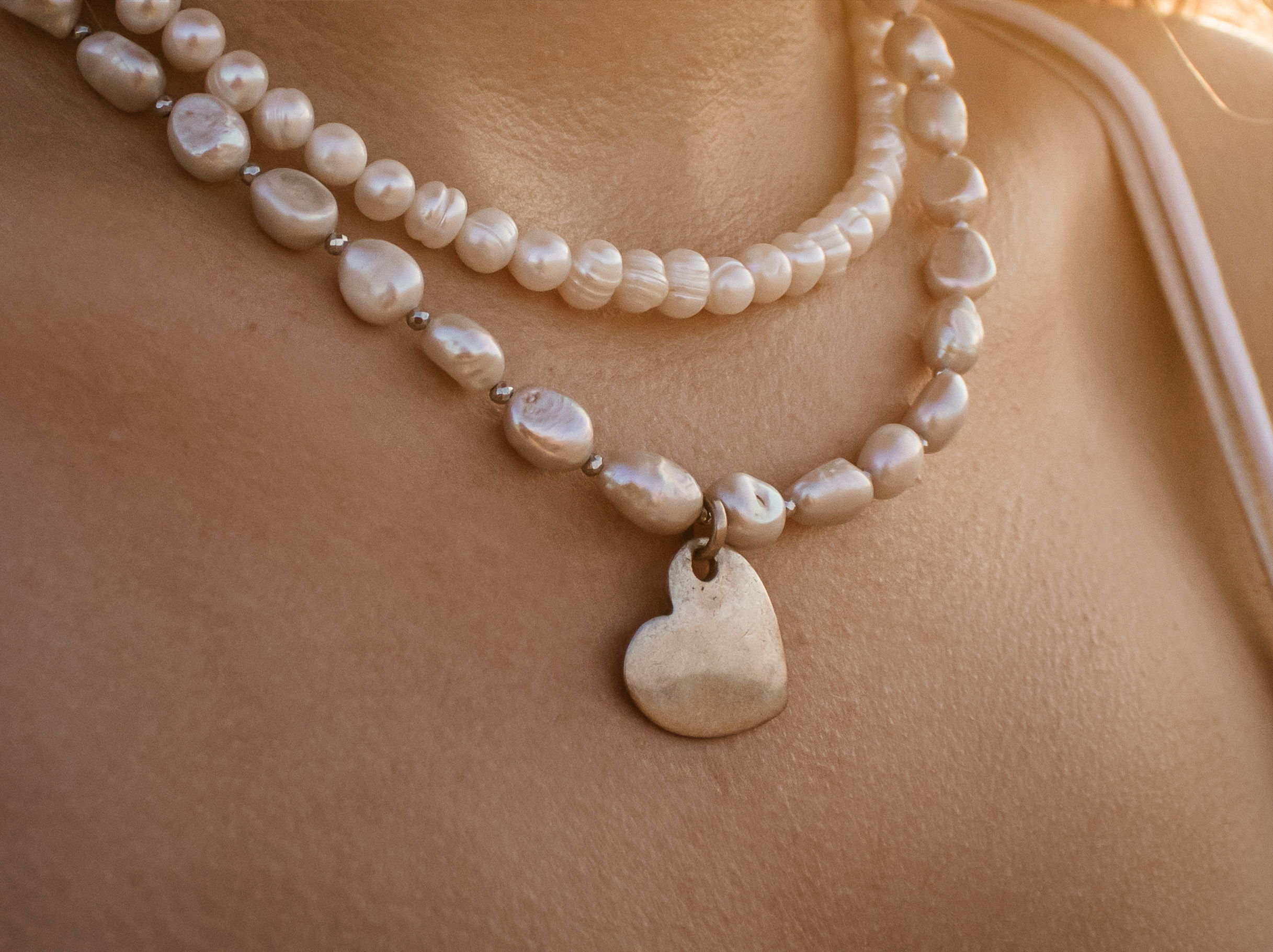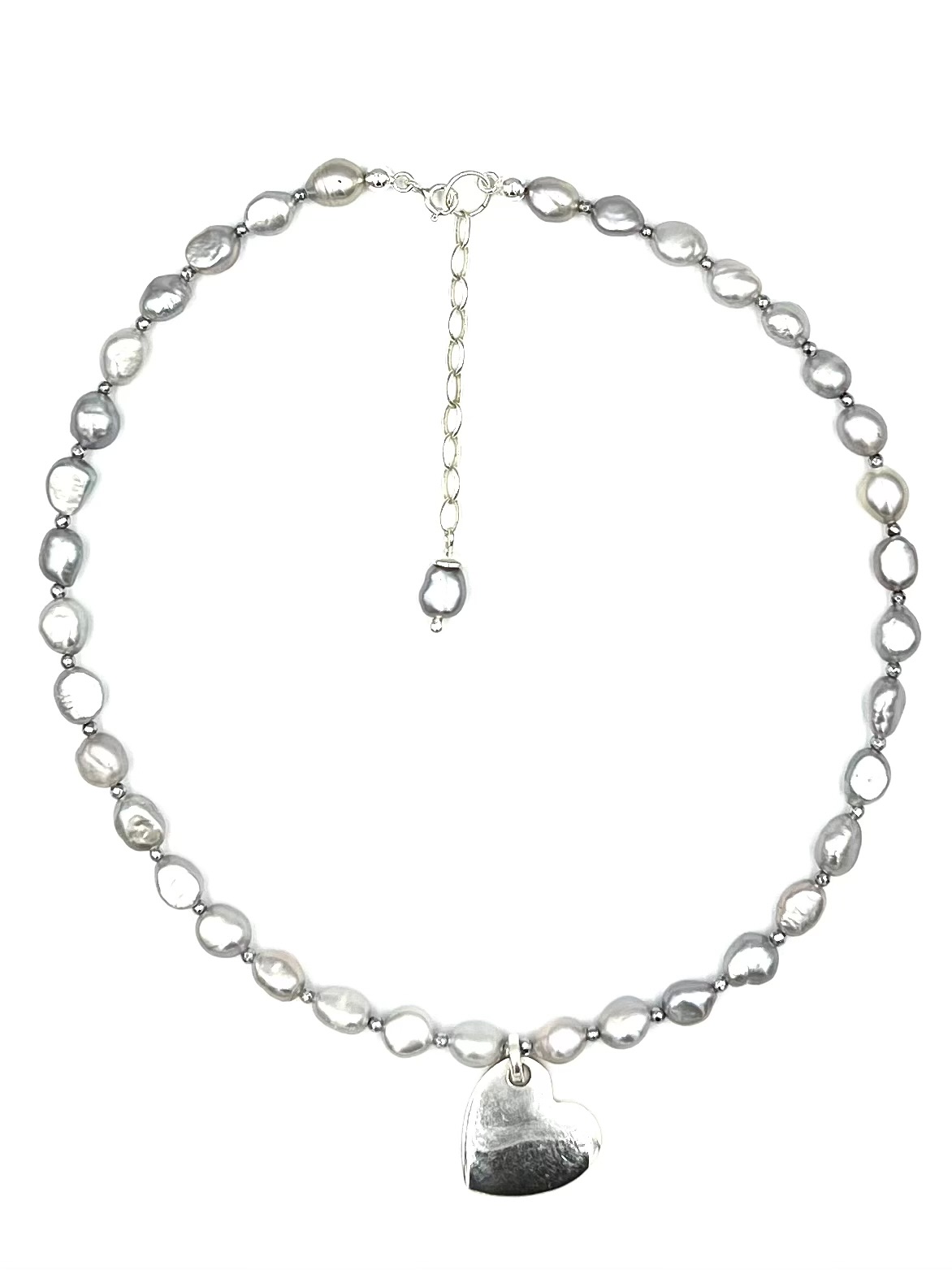 Necklace with grey pearls, hematites, silver clasp and a silver heart-shaped pendant.