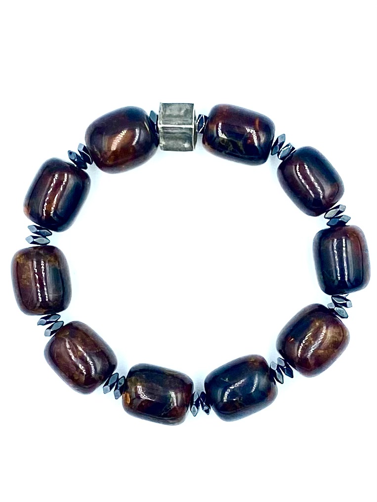 Flexible man’s bracelet with cognac amber, hematites and an oxidised silver cube.