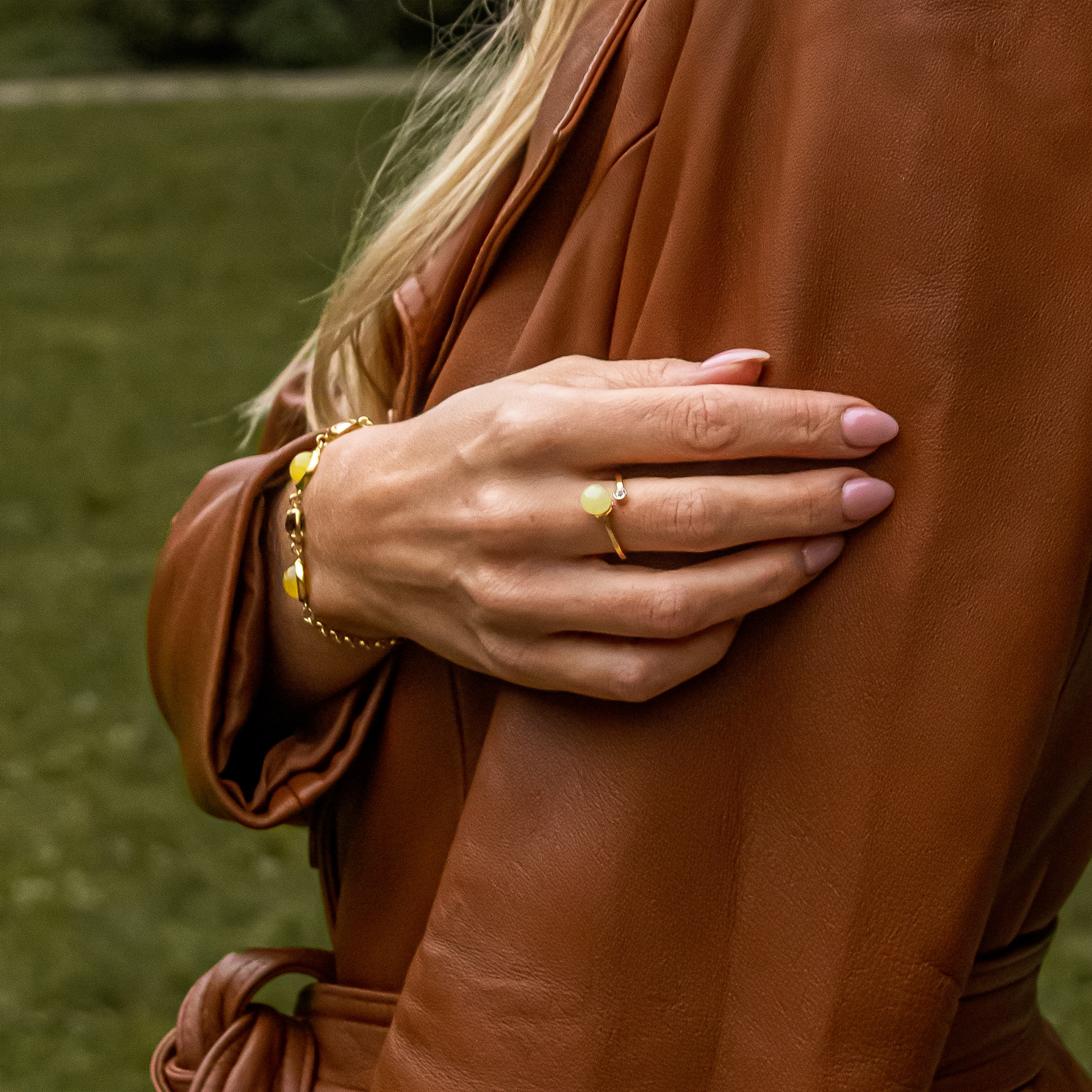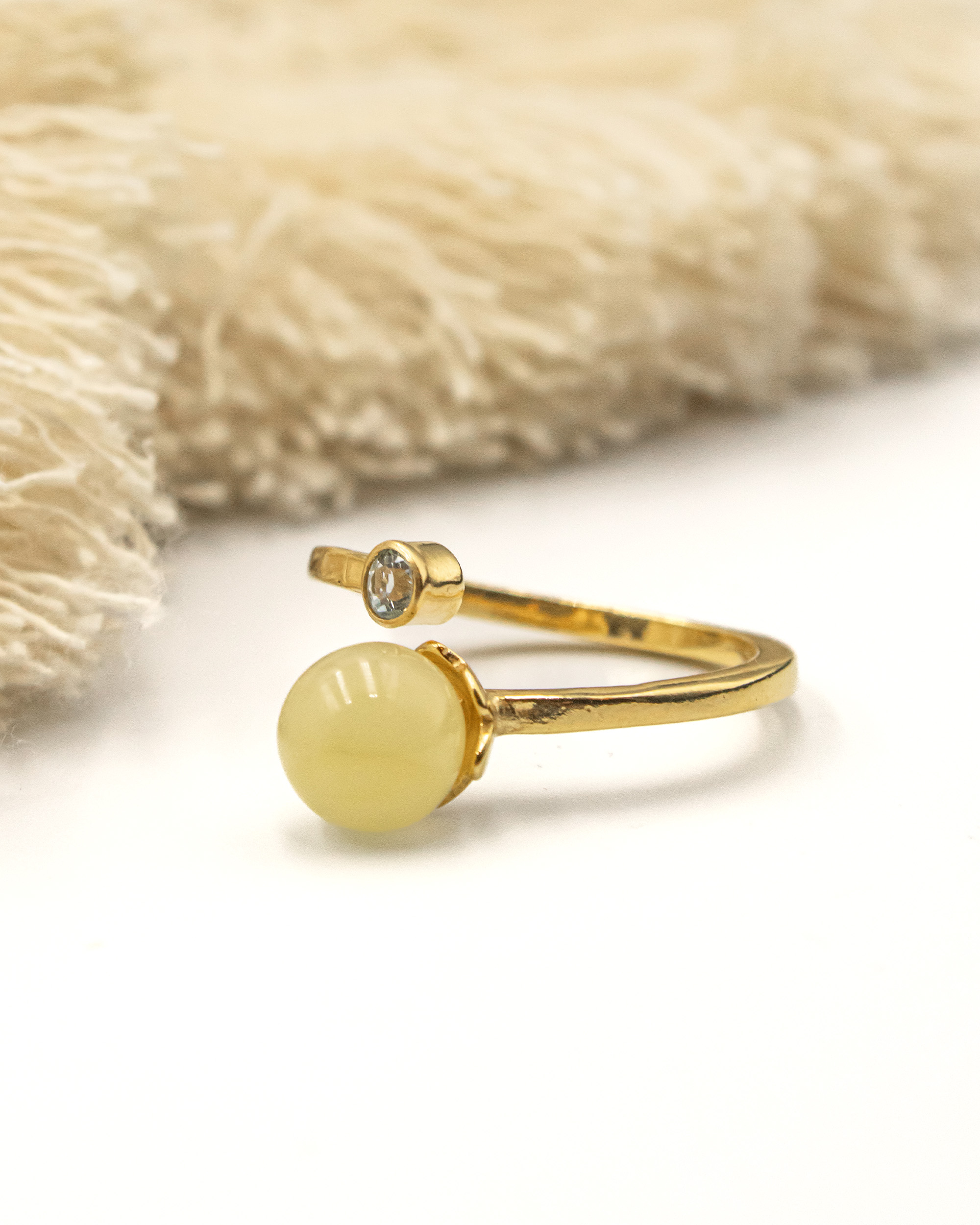 Adjustable ring with milky amber and topaz made of silver gold-plated with 24 carat gold.
