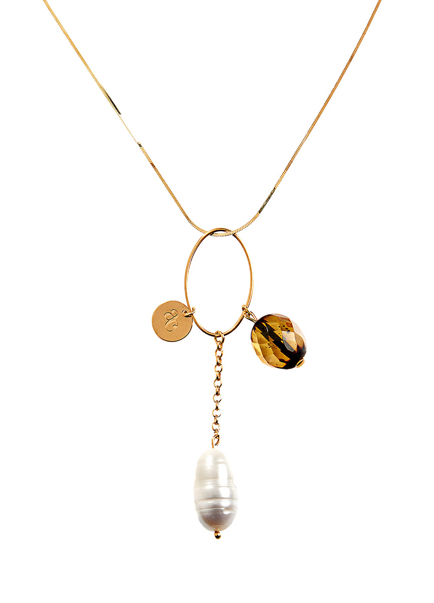 24 carats gold-plated silver necklace with cherry-green amber, a pearl and original oval.