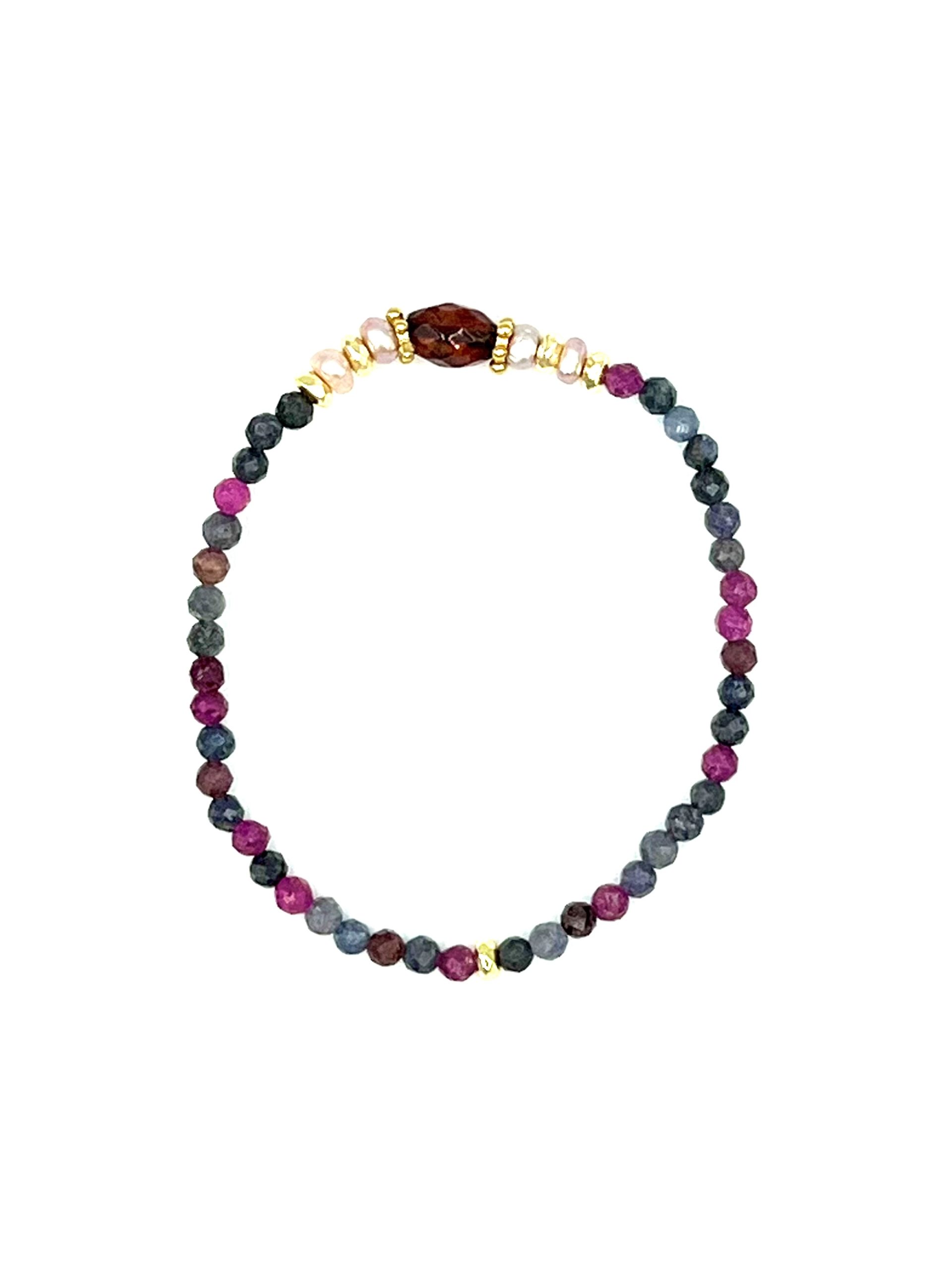Elastic bracelet with ruby and sapphire stone, gold-plated silver and a facet, cherry amber.