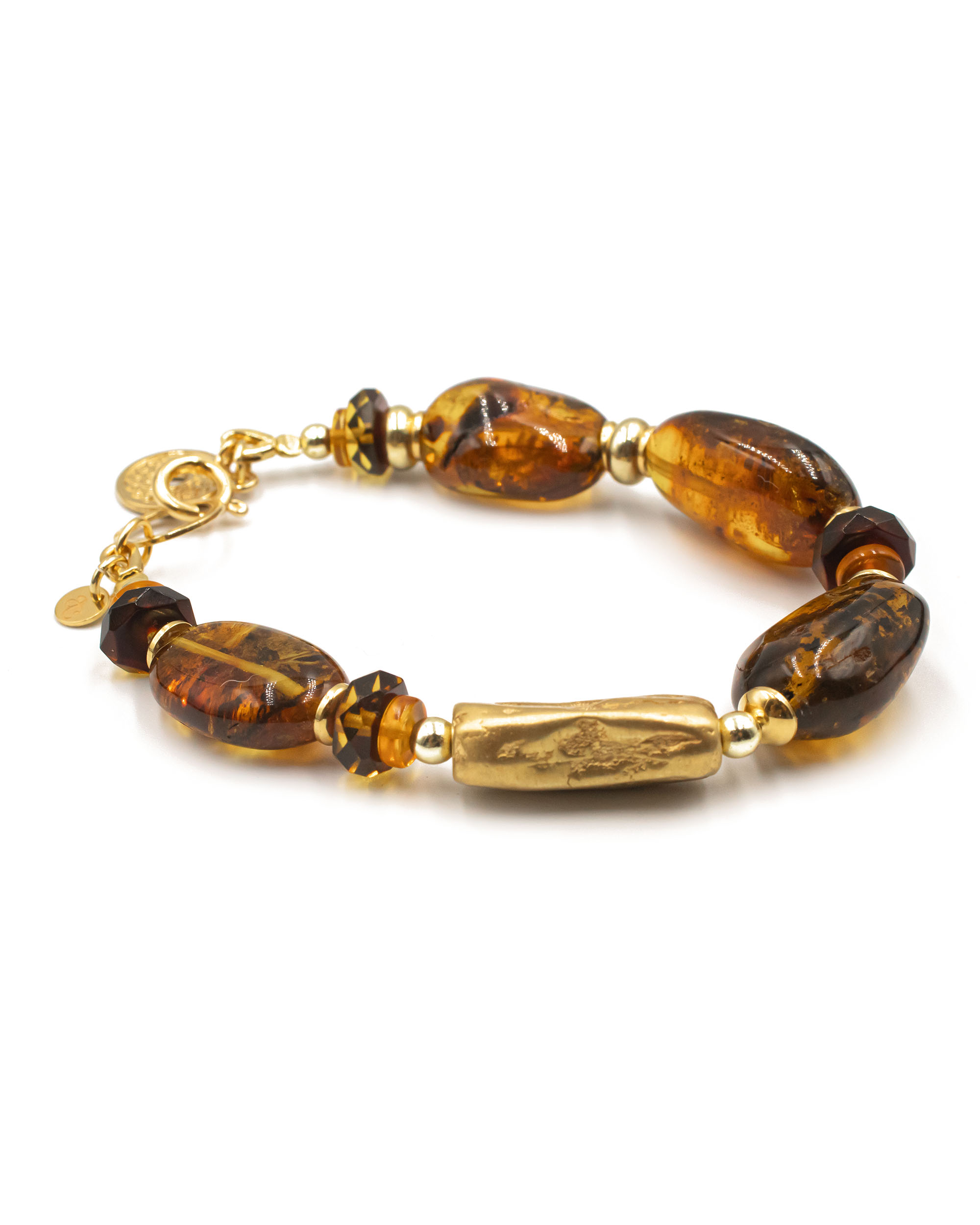 Bracelet with cognac-green ambers and gold-plated elements.