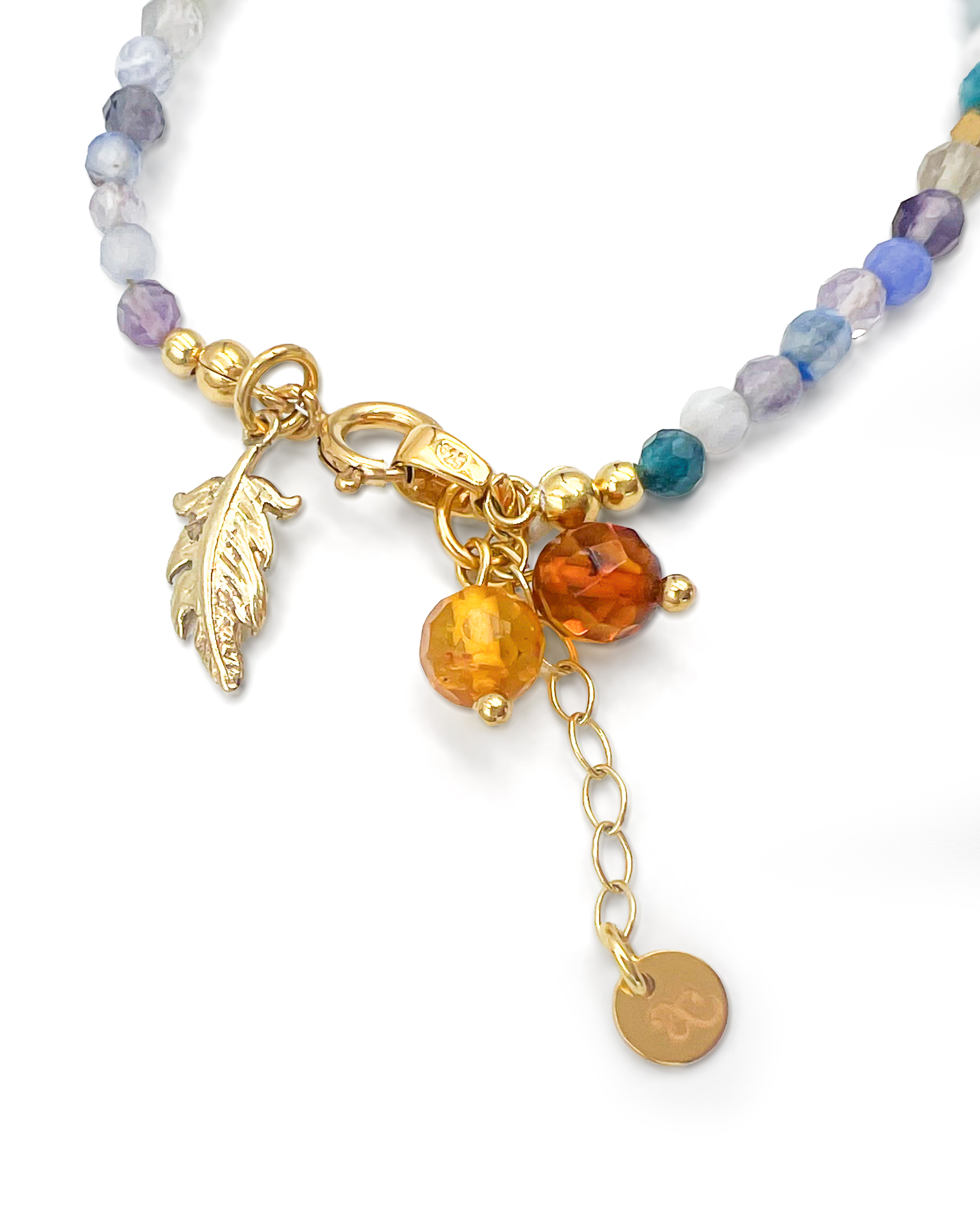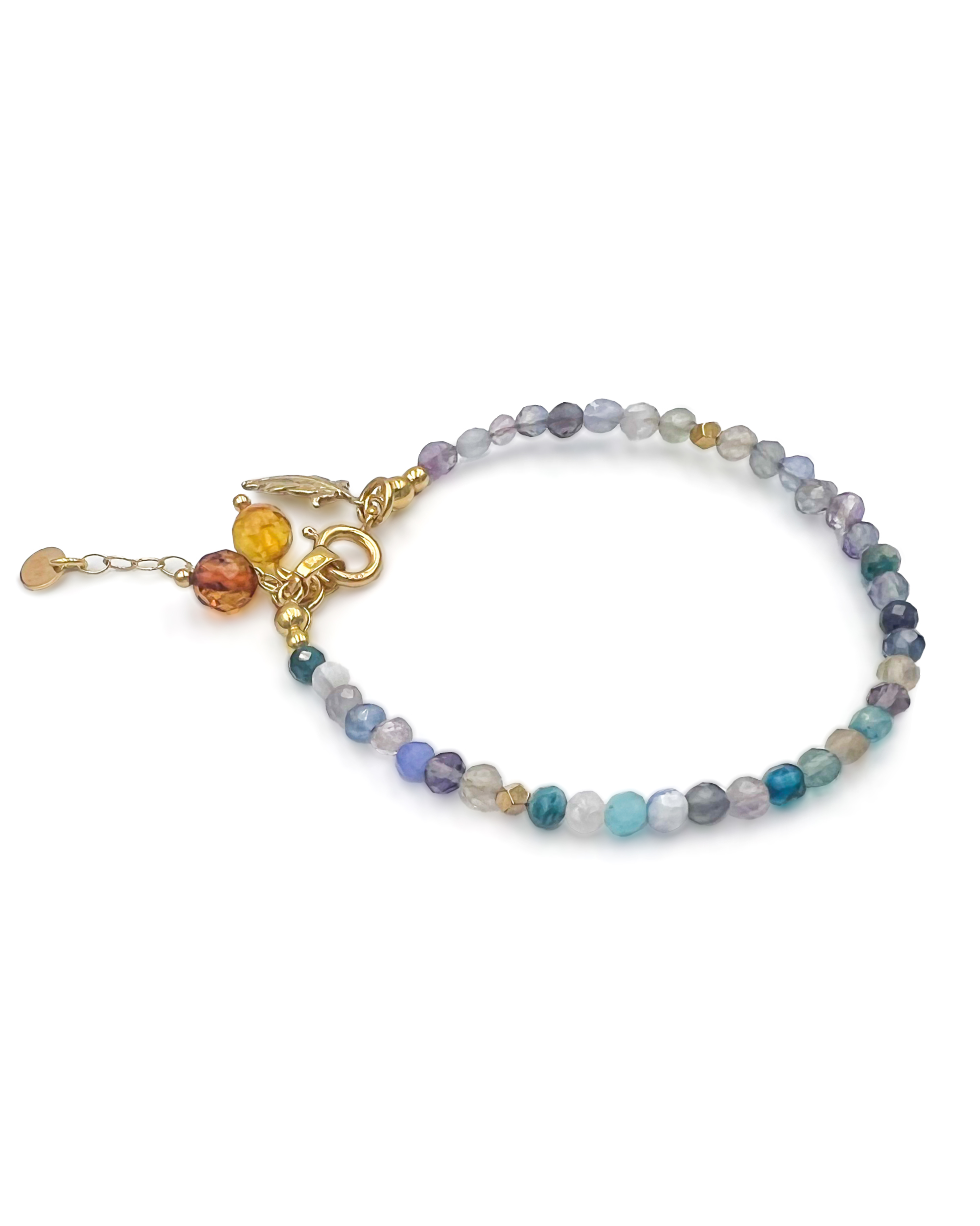 Bracelet with fluorite stones, diamond cut amber, gold-plated decorative elements.