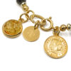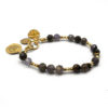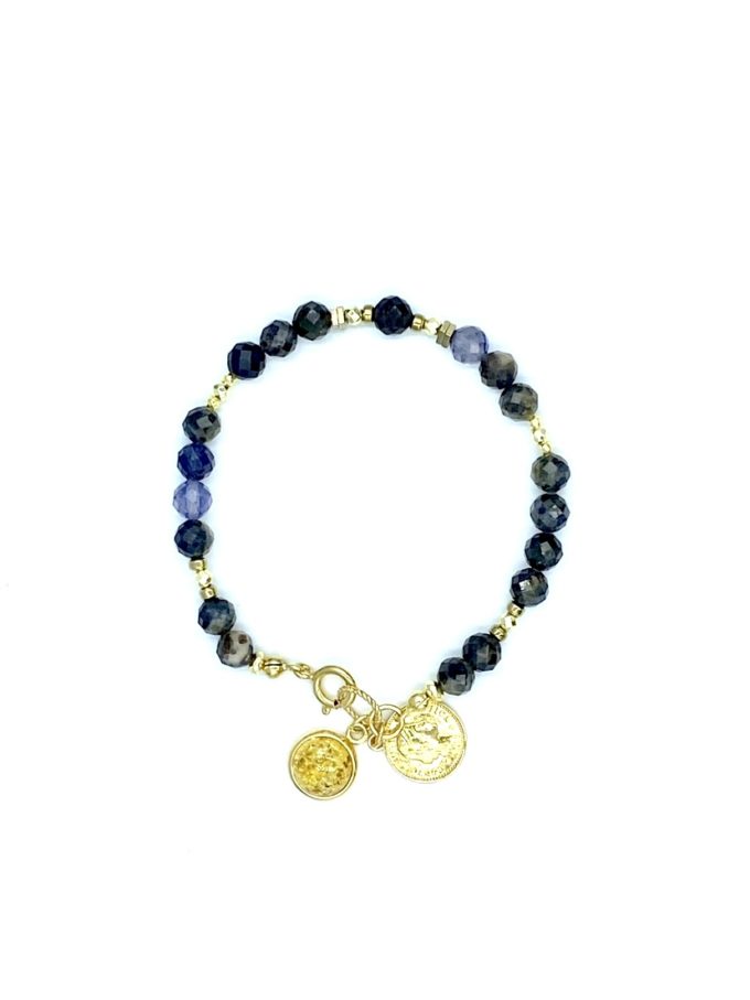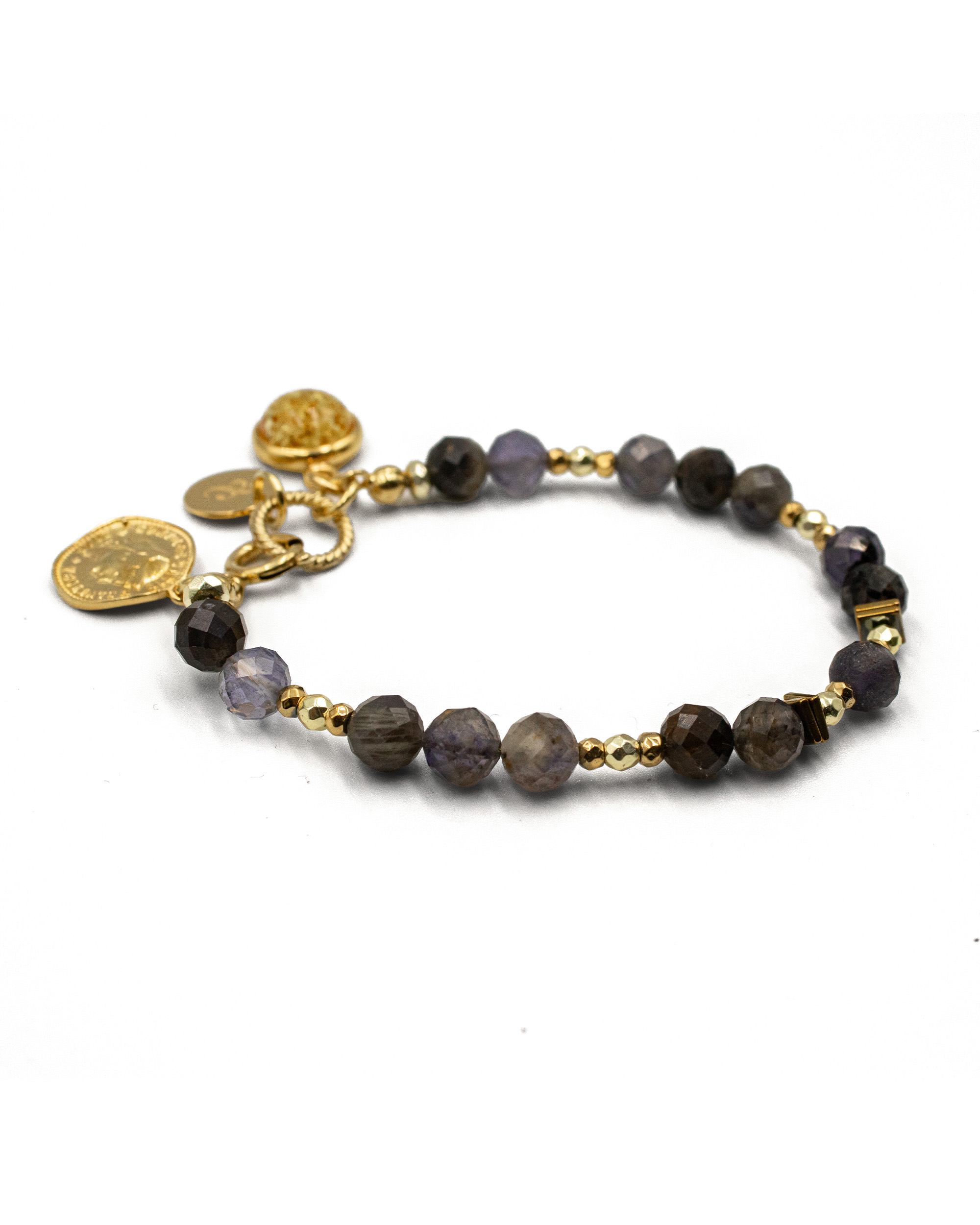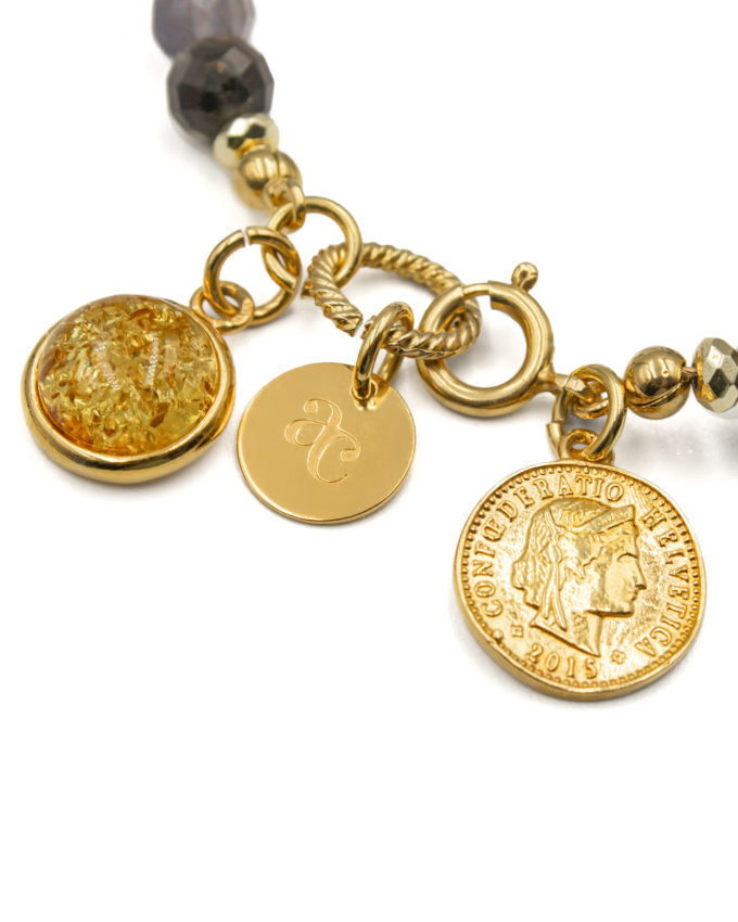 Bransoletka z lolitem, złotymi hematytami, pozłacanym zapięciem oraz dekoracyjną zawieszką i bursztynem.