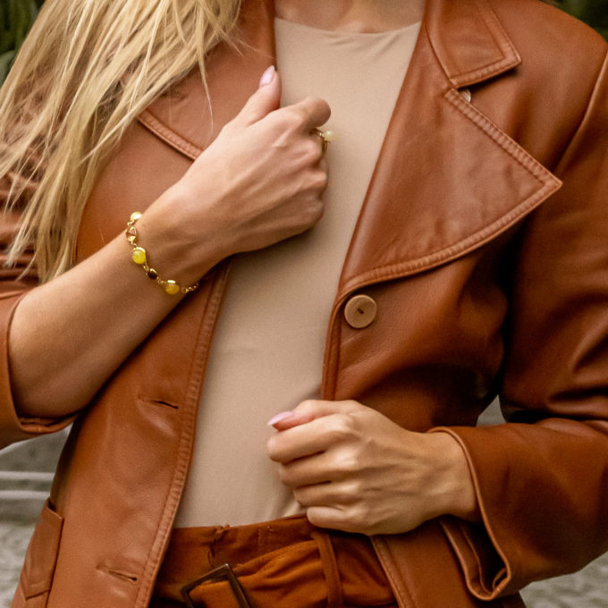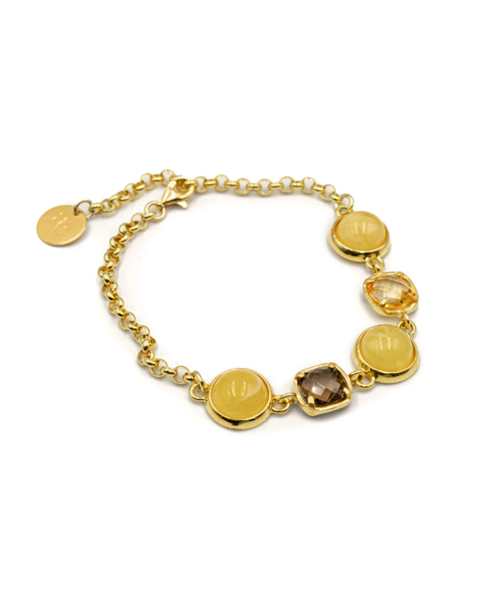 Pozłacana 24-karatowym złotem srebrna bransoletka z mlecznym bursztynem, kwarcem i cytrynem.