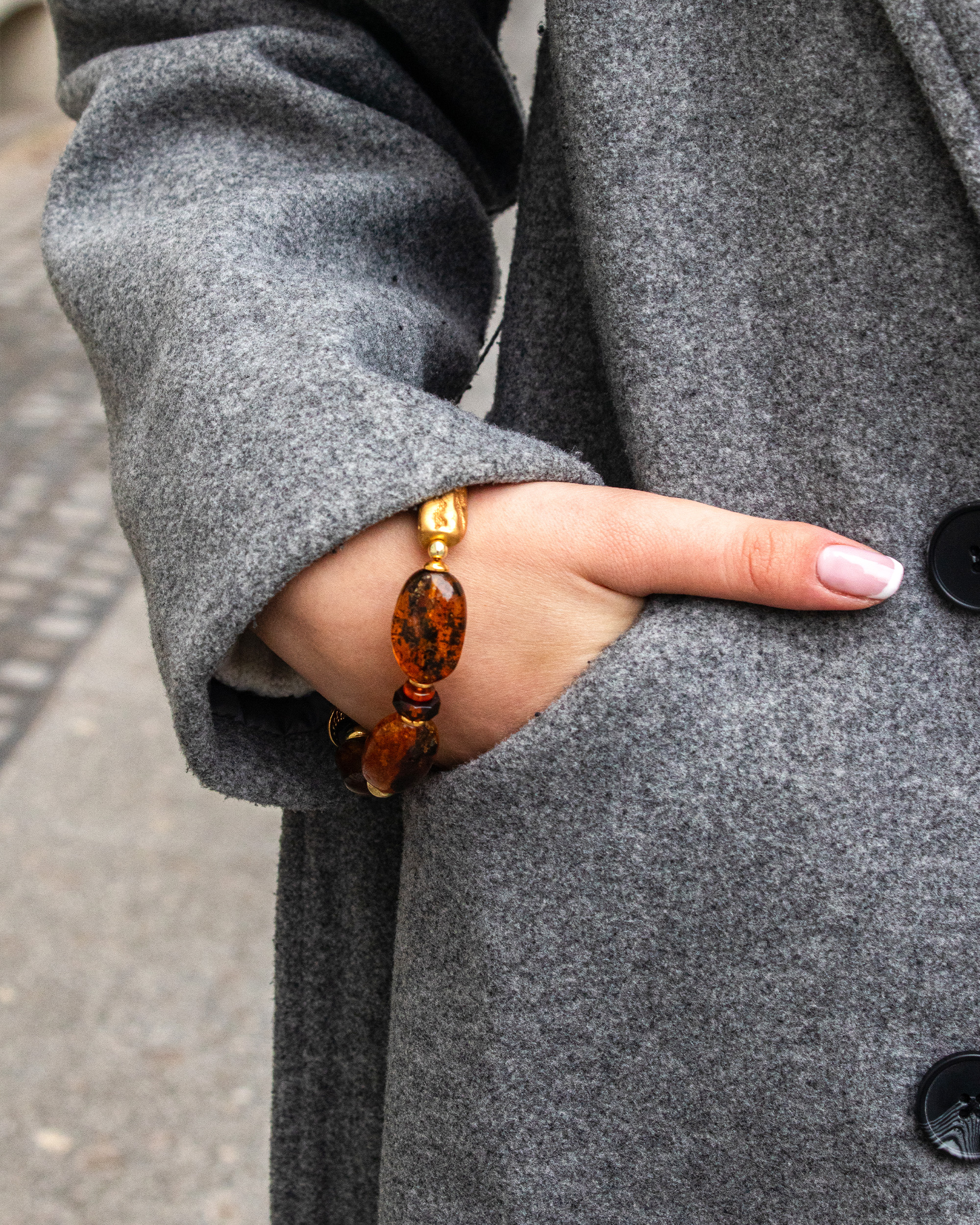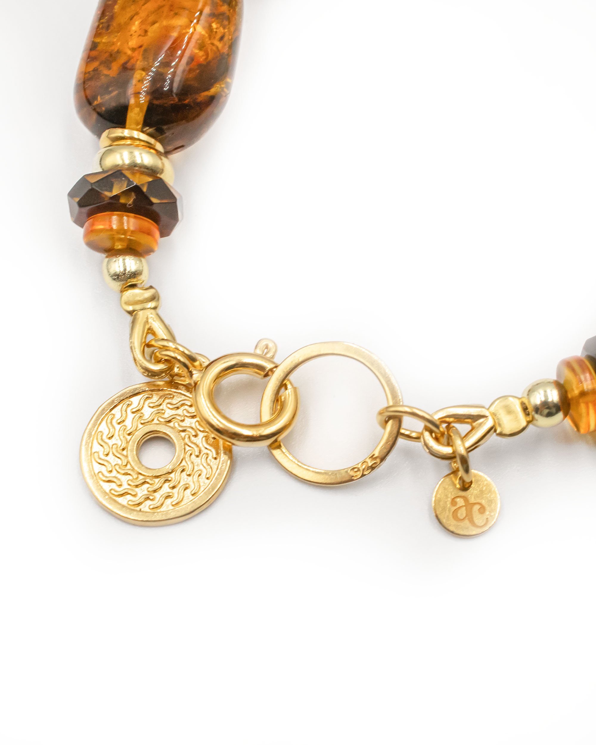 Bransoletka z koniakowo-zielonymi bursztynami i pozłacanymi elementami.