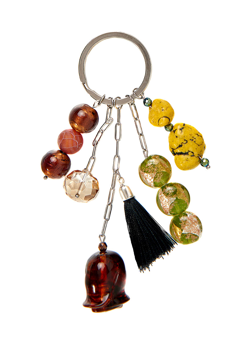 Stalowy breloczek z dodatkiem bursztynu, howlitu, szkła, kryształu Swarovskiego oraz ozdobnego chwostu.