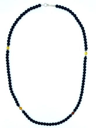 Męska bransoleta na czarnej nitce z ciemnym, wiśniowym bursztynem i czarnymi kryształkami.