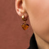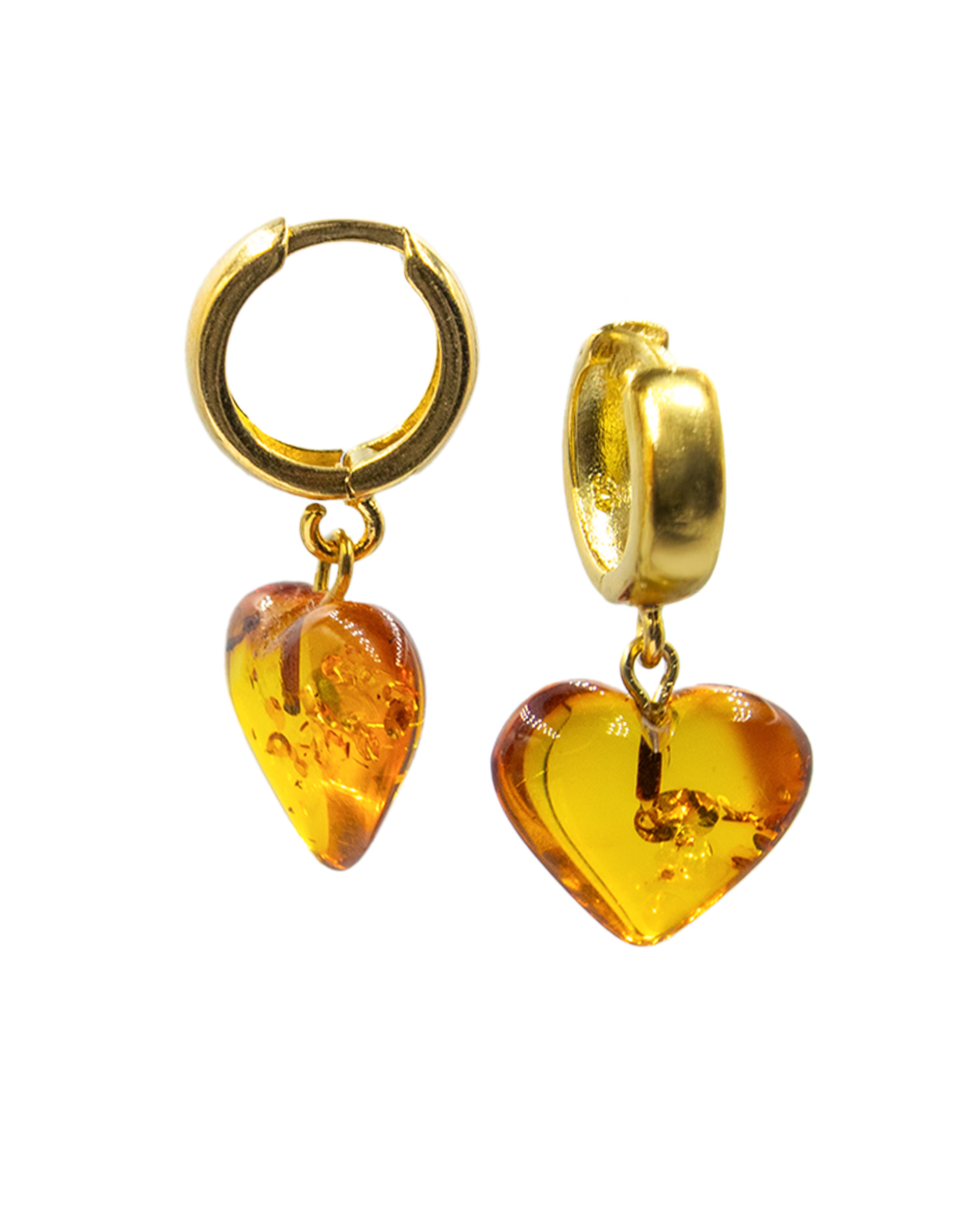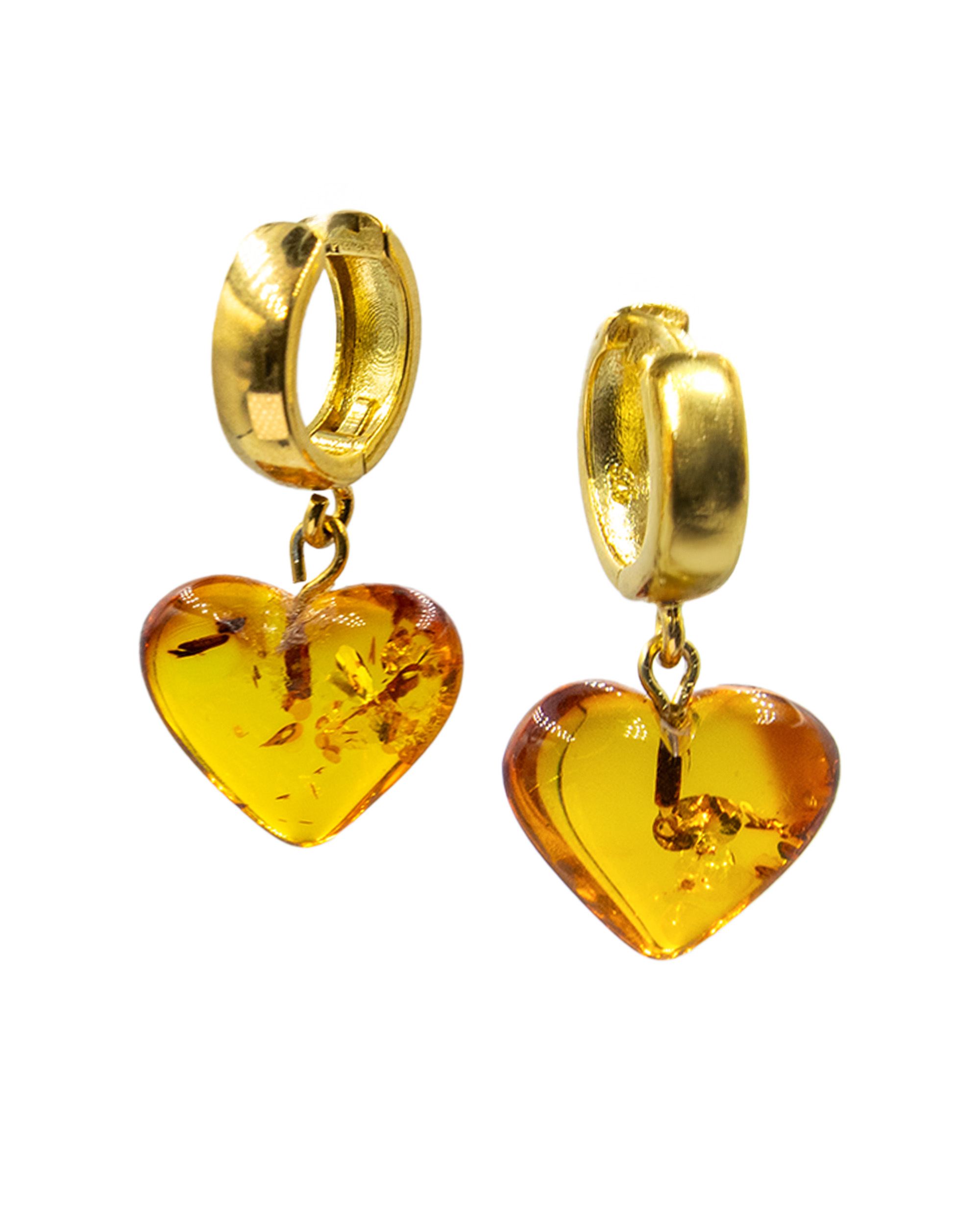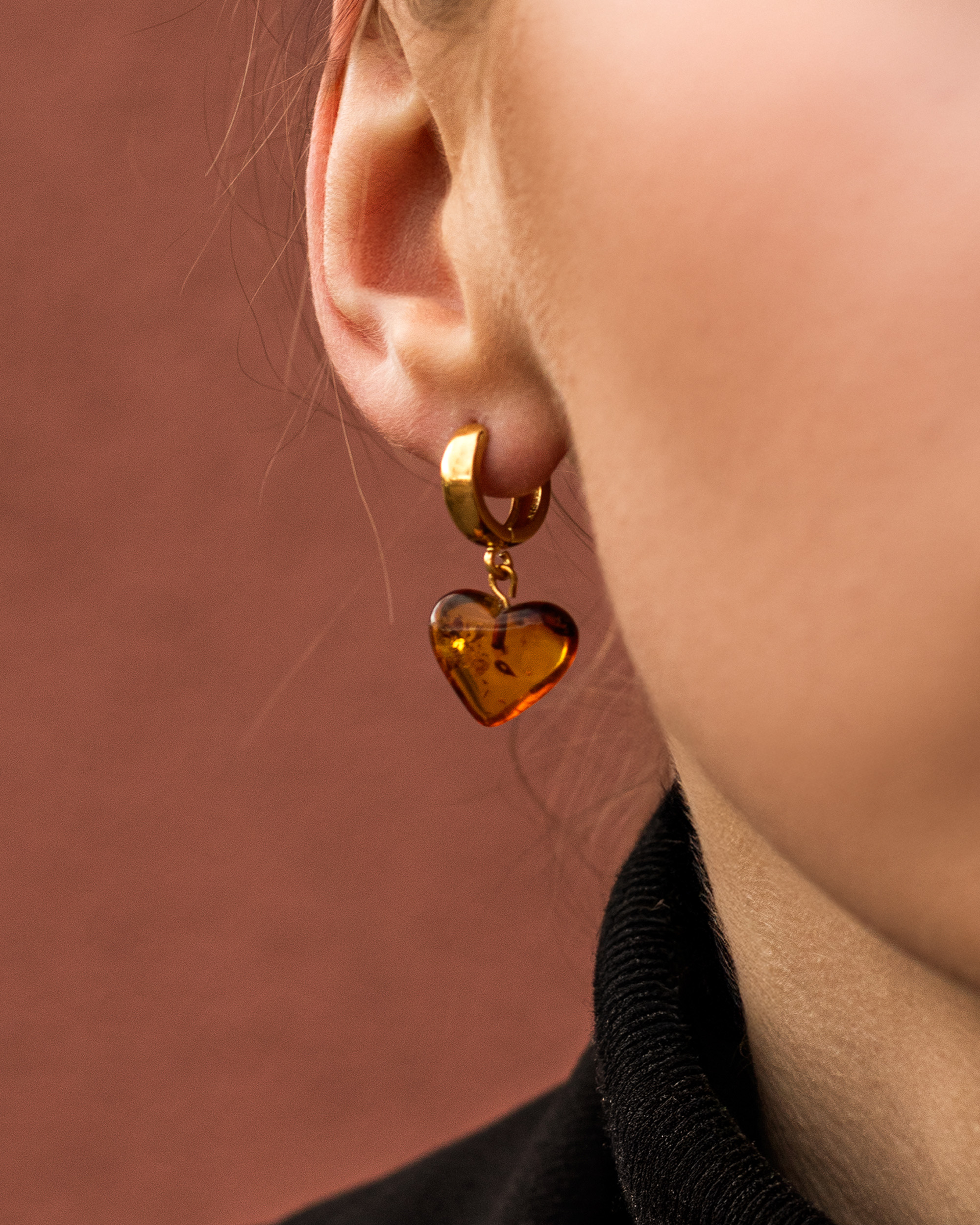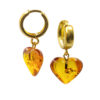 Kolczyki z okrągłym złoconym zapięciem oraz koniakowym bursztynem w kształcie serca.