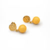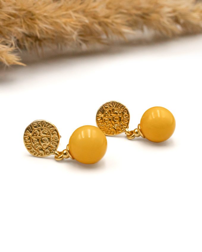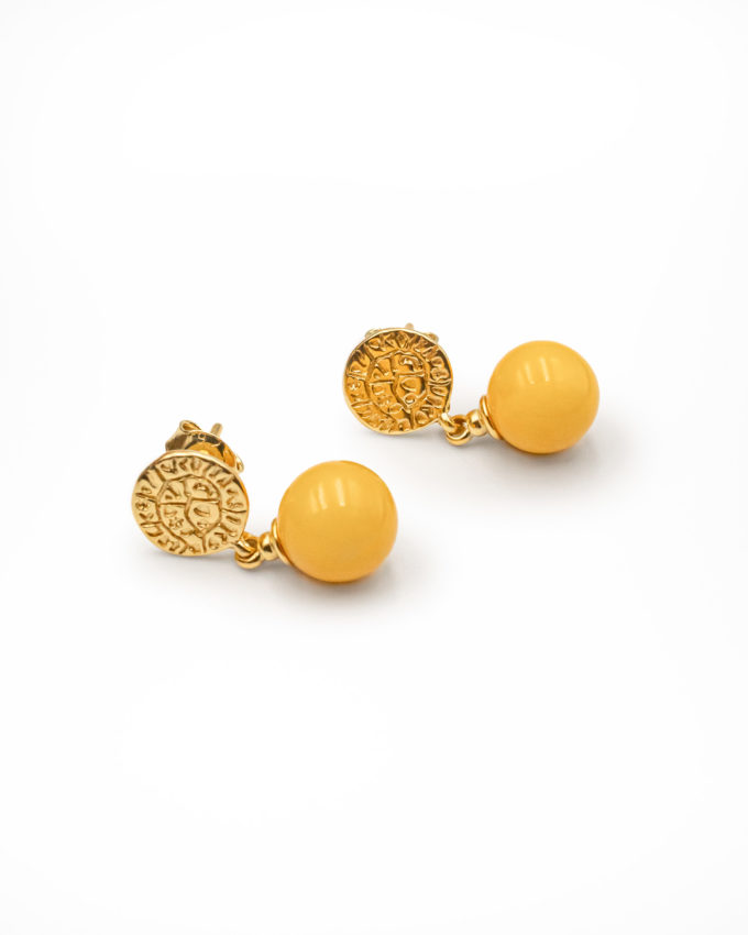 Kolczyki z mlecznym bursztynem i ozdobną monetą.