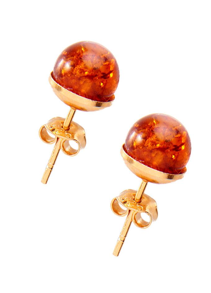 Kolczyki, typu sztyft z koniakowym bursztynem w kształcie półkuli.