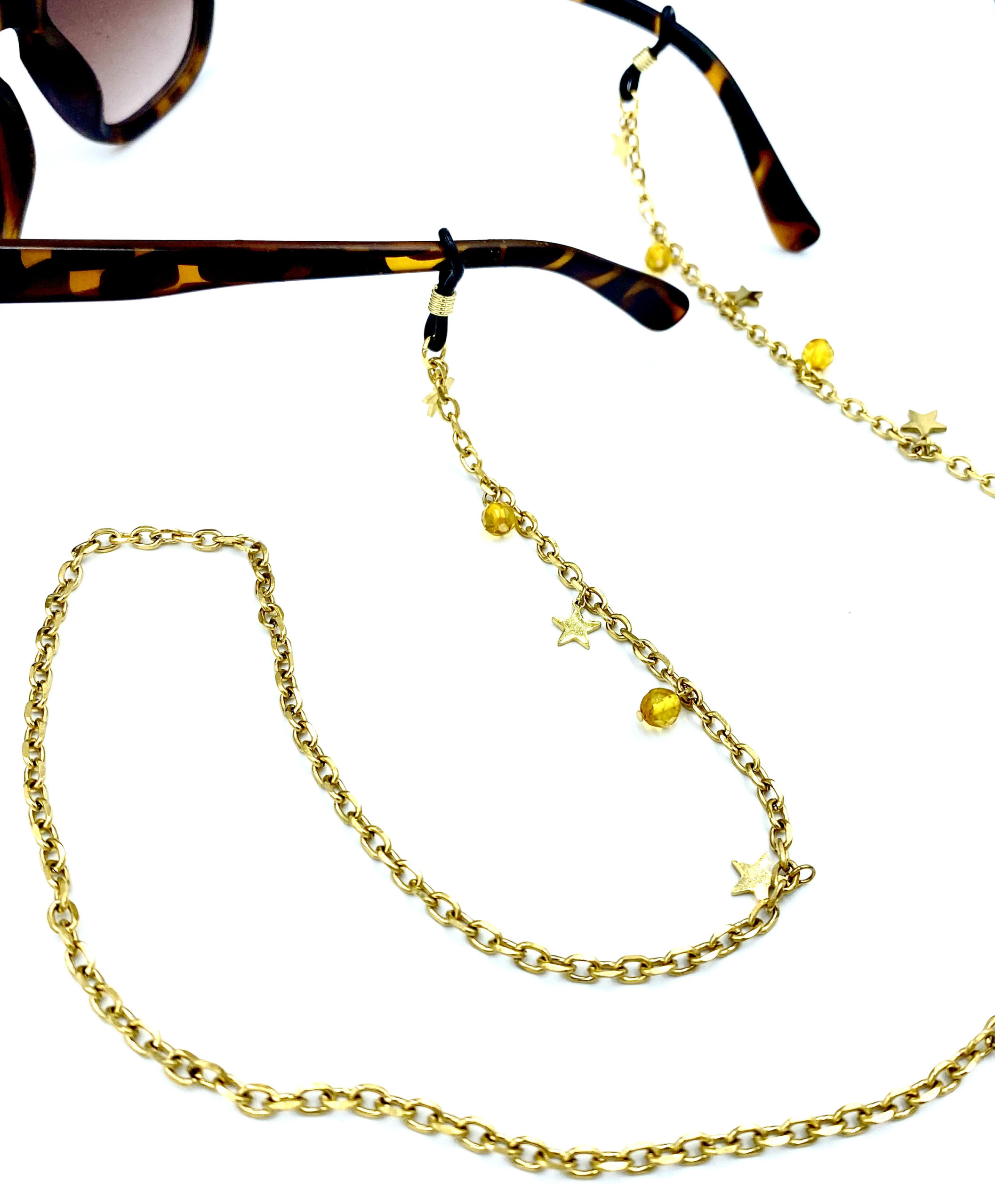 Stalowy łańcuszek do okularów z ozdobnymi zawieszkami i cytrynowym bursztynem.