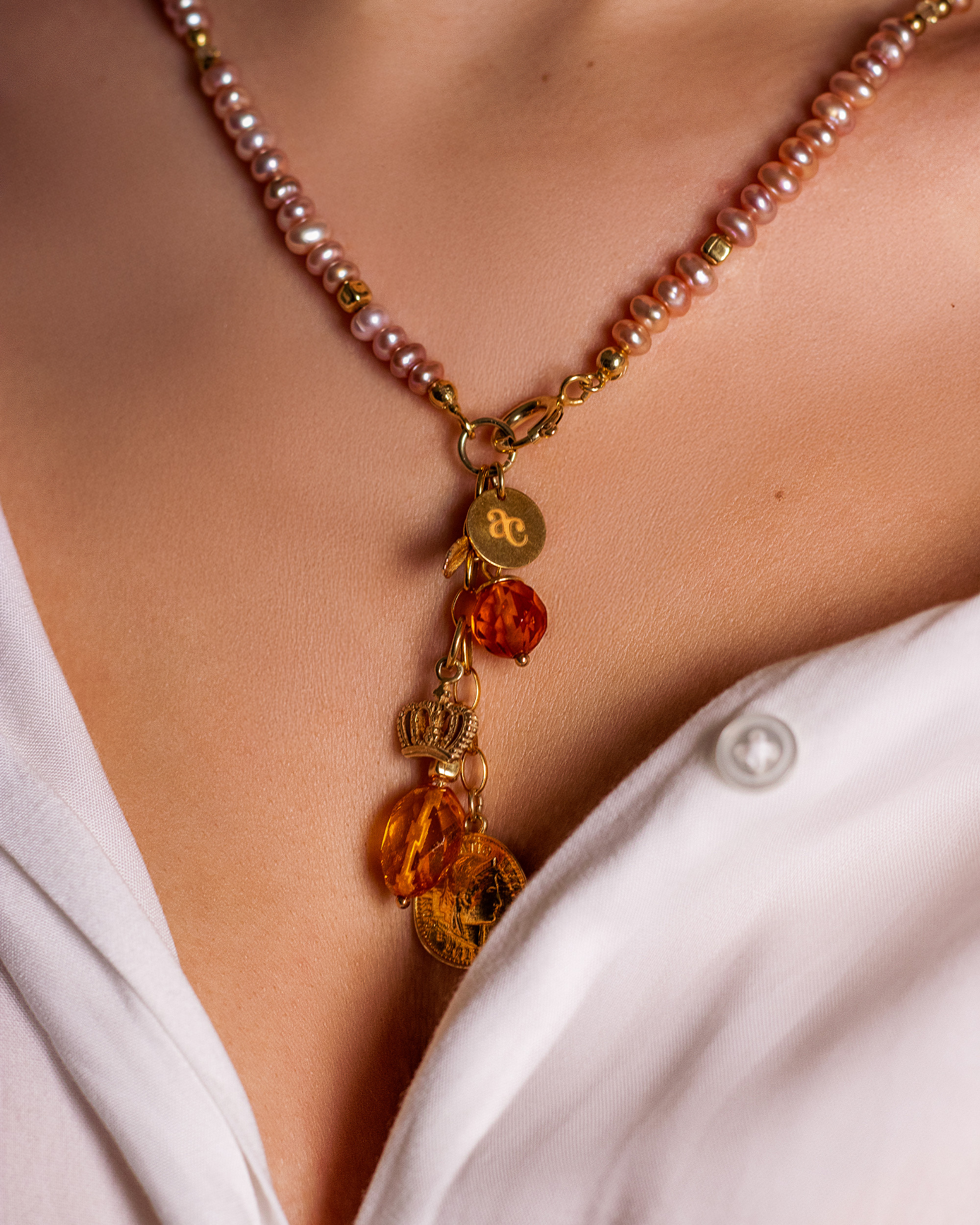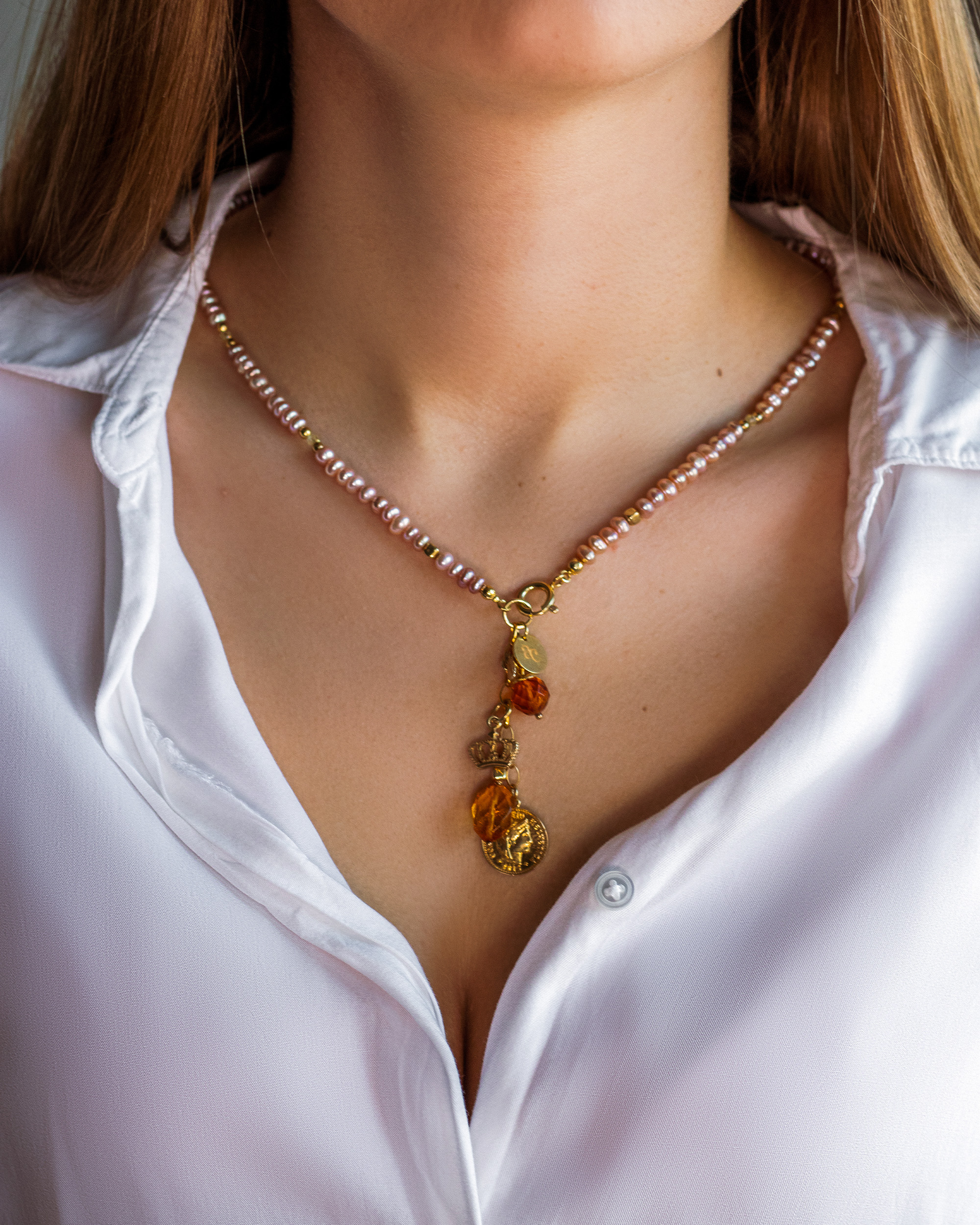 Naszyjnik/ bransoletka z perłami hodowlanymi, cytrynowymi bursztynami i pozłacanymi zawieszkami.