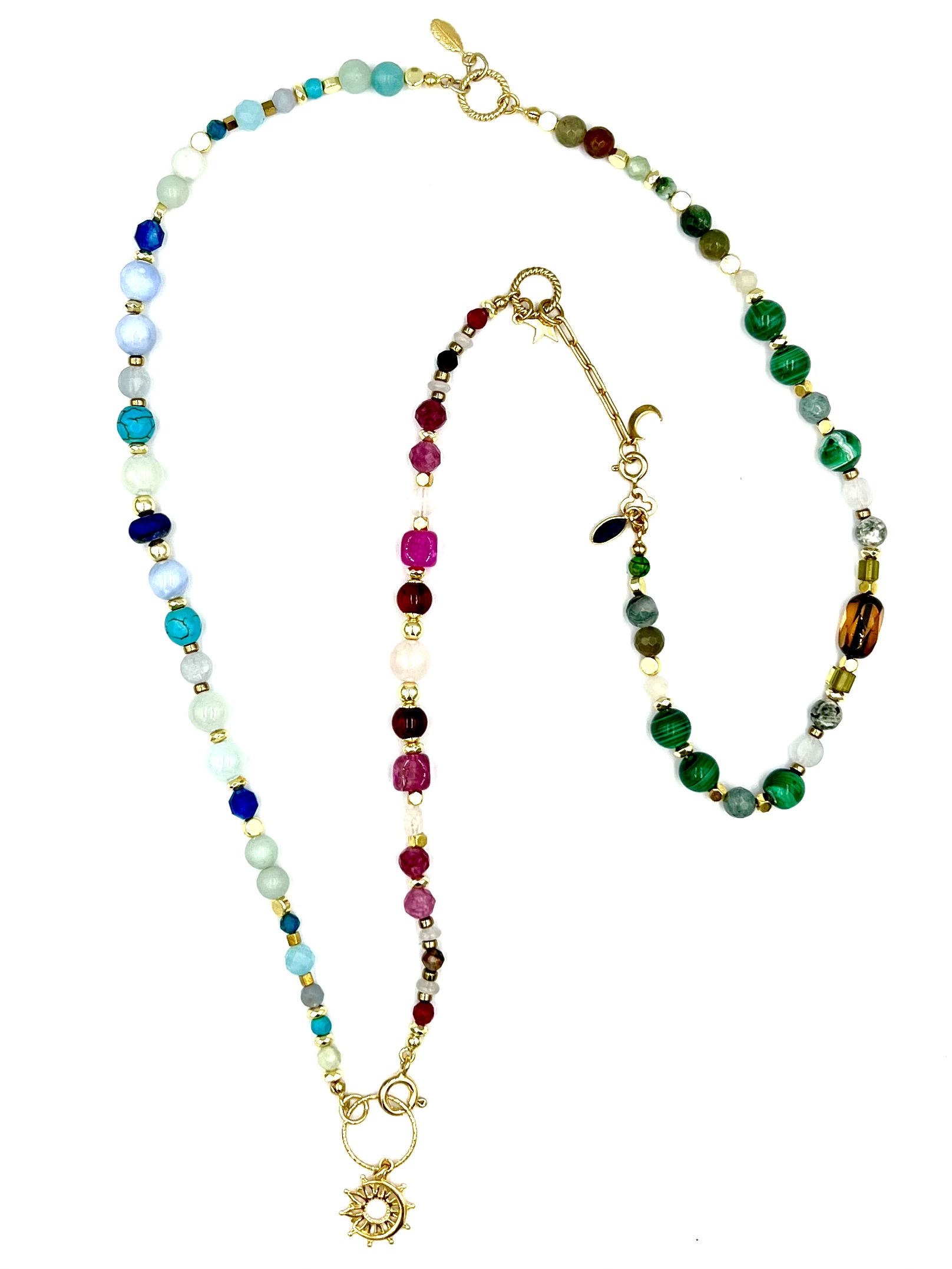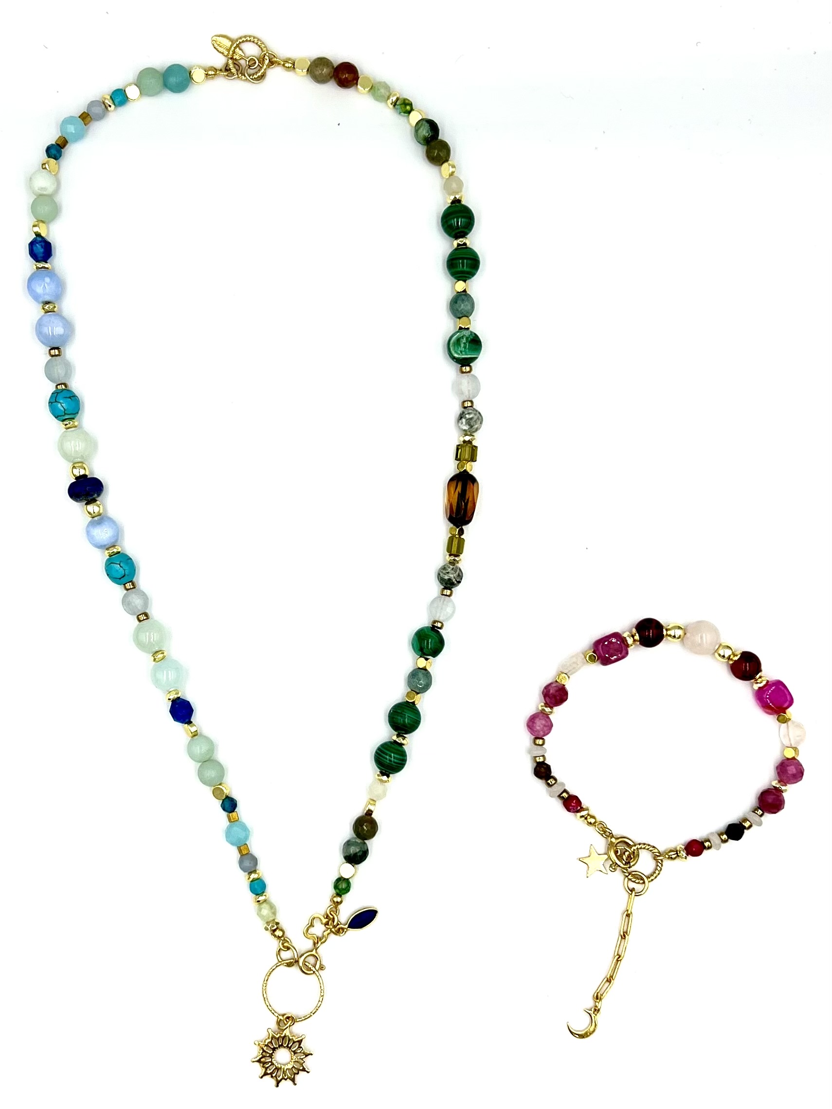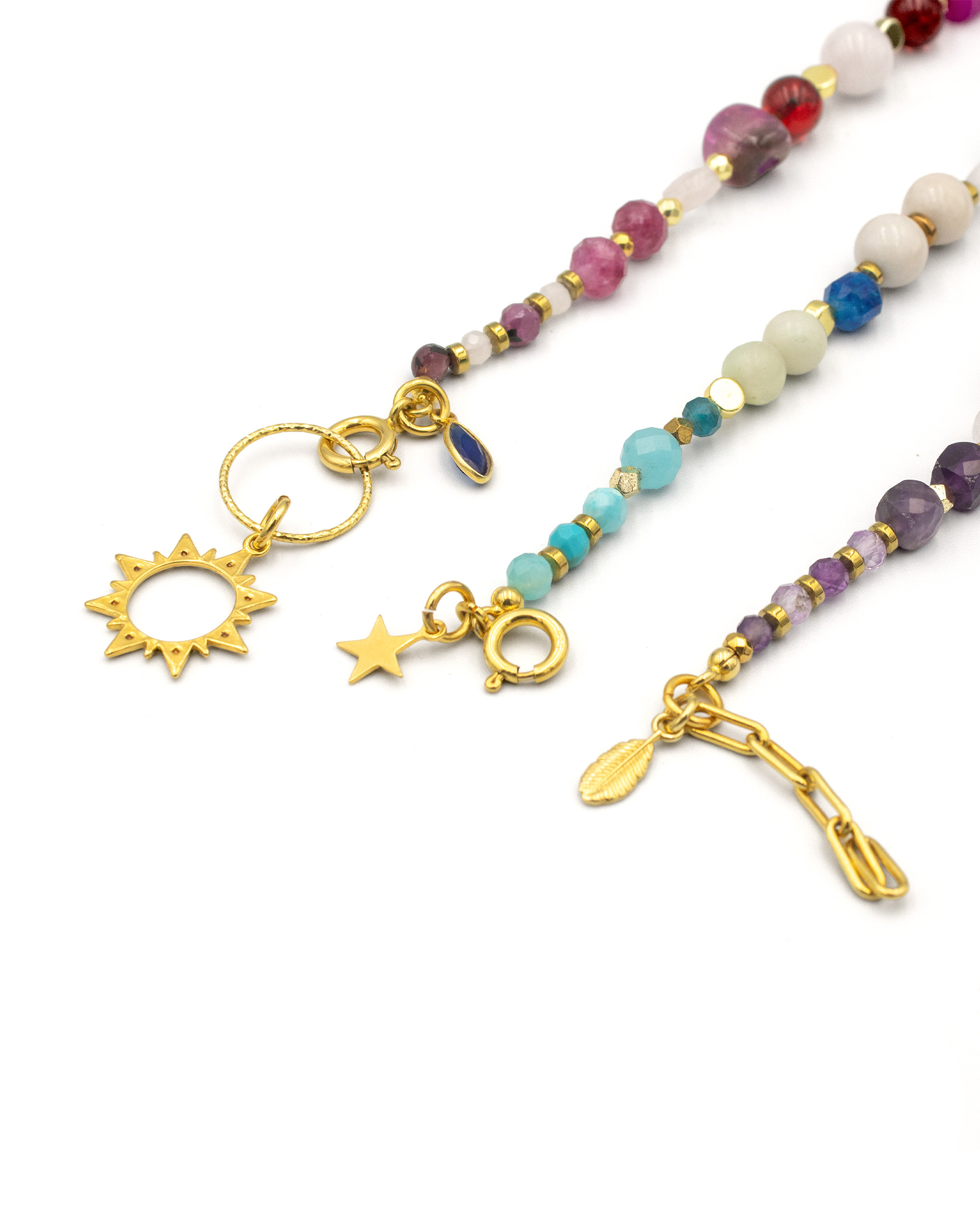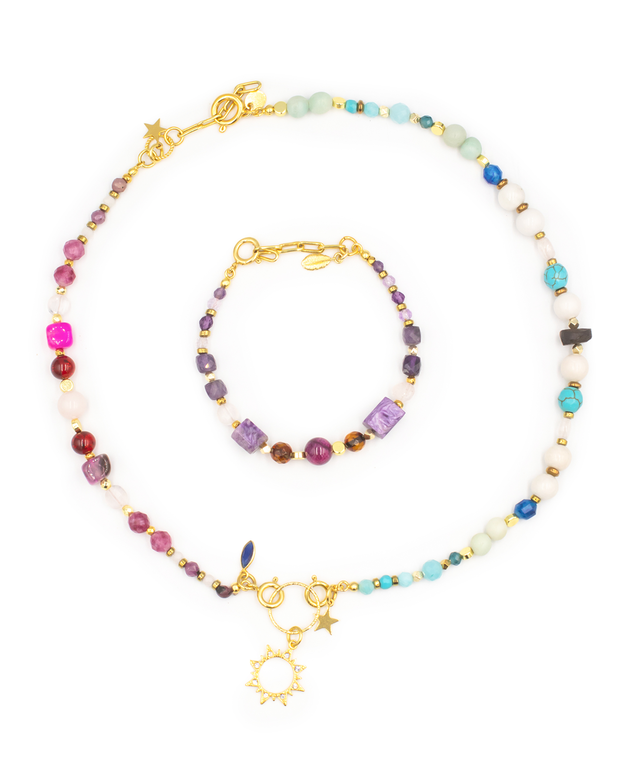 Naszyjnik z różnorodnymi kamieniami naturalnymi i bursztynem oraz pozłacanymi dodatkami i zapięciem. Istnieje możliwość wypięcia bransoletki i stworzenia zestawu z krótkim naszyjnikiem.