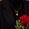 Naszyjnik z zielono-wiśniowym, fasetowanym bursztynem i ozdobnym, pozłacanym zapięciem z monetą.