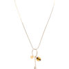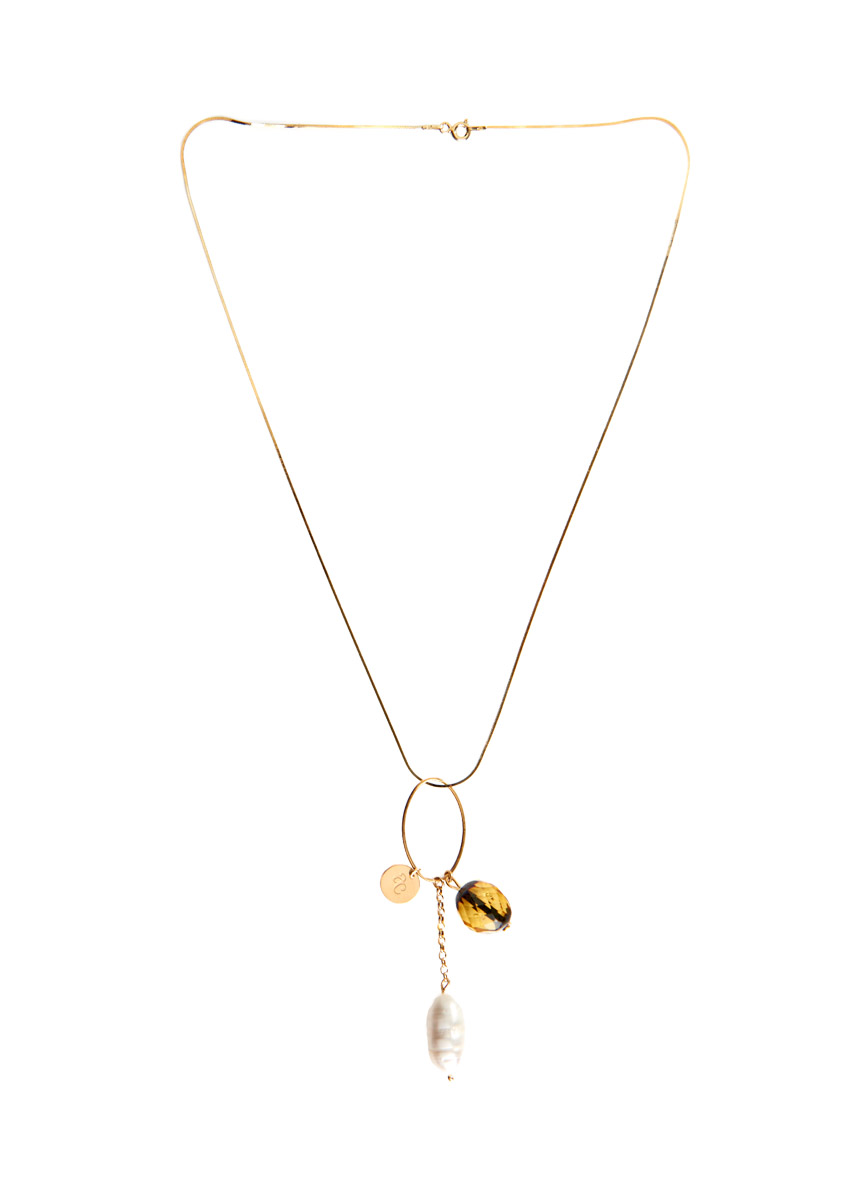 Złocony 24 karatowym złotem naszyjnik z wiśniowo- zielonym bursztynem, perłą hodowlaną oraz oryginalnym owalem.