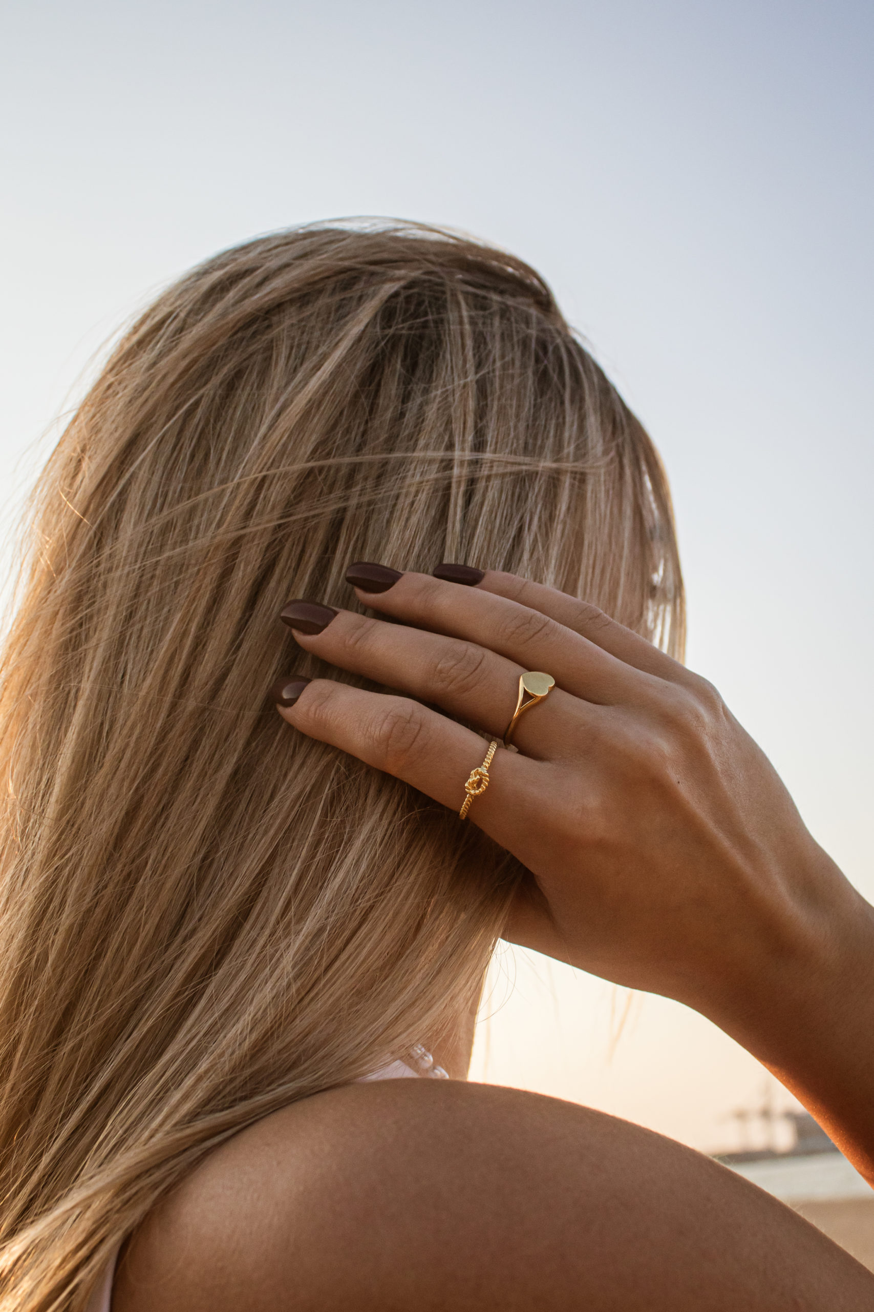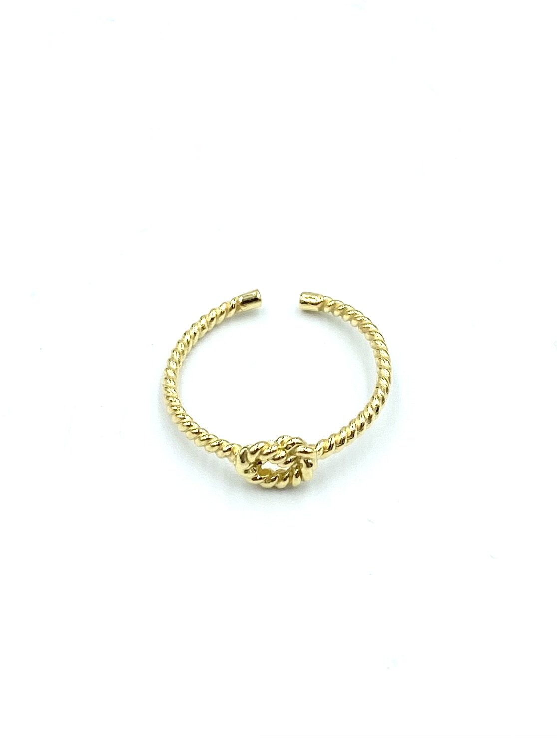 Regulowany pierścionek z supełkiem, wykonany ze srebra złoconego 24-karatowym złotem.